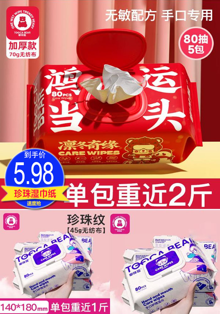 【券后价:5.98元】 【首单+签到】嘟咔熊珍珠湿巾纸80抽