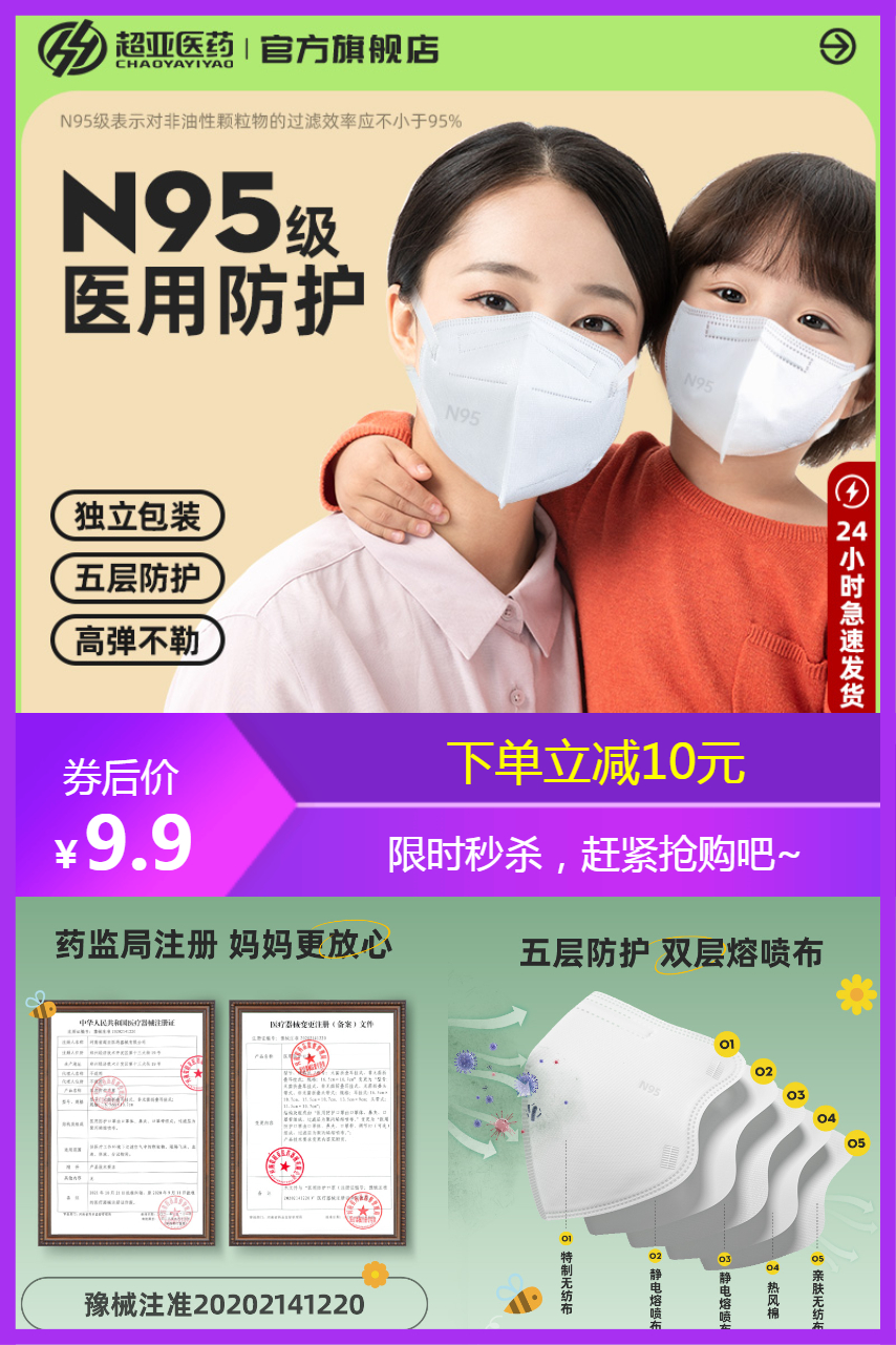 超亚N95医用防护口罩!!5层防护级别,精选优质熔喷布,轻薄透气,畅爽呼吸。质量保证,放心使用,呵护全家人的安全!