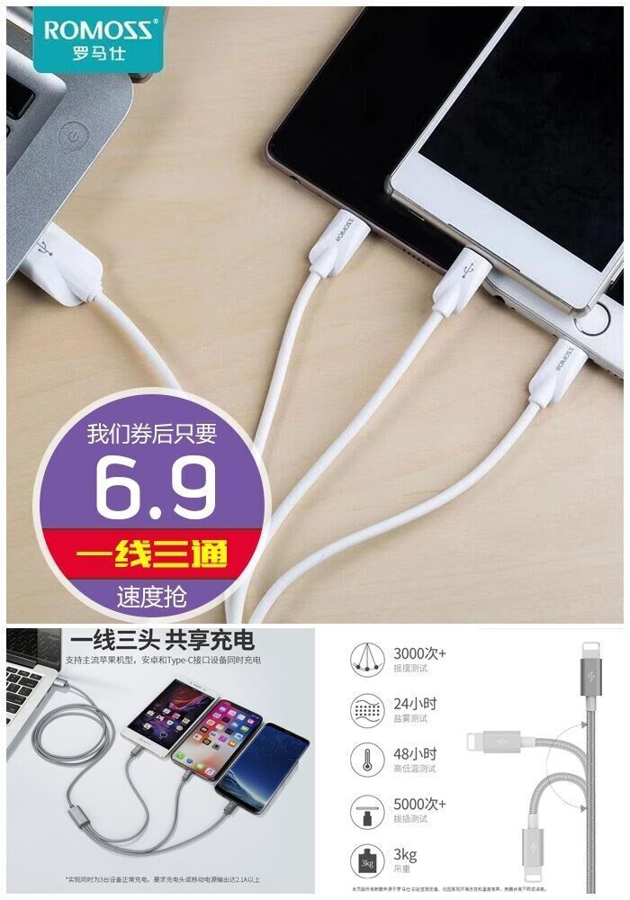 罗马仕三合一数据线,值得信赖,全新升级,安全提速,苹果安卓华为通用,三部设备,共享充电,车载必备