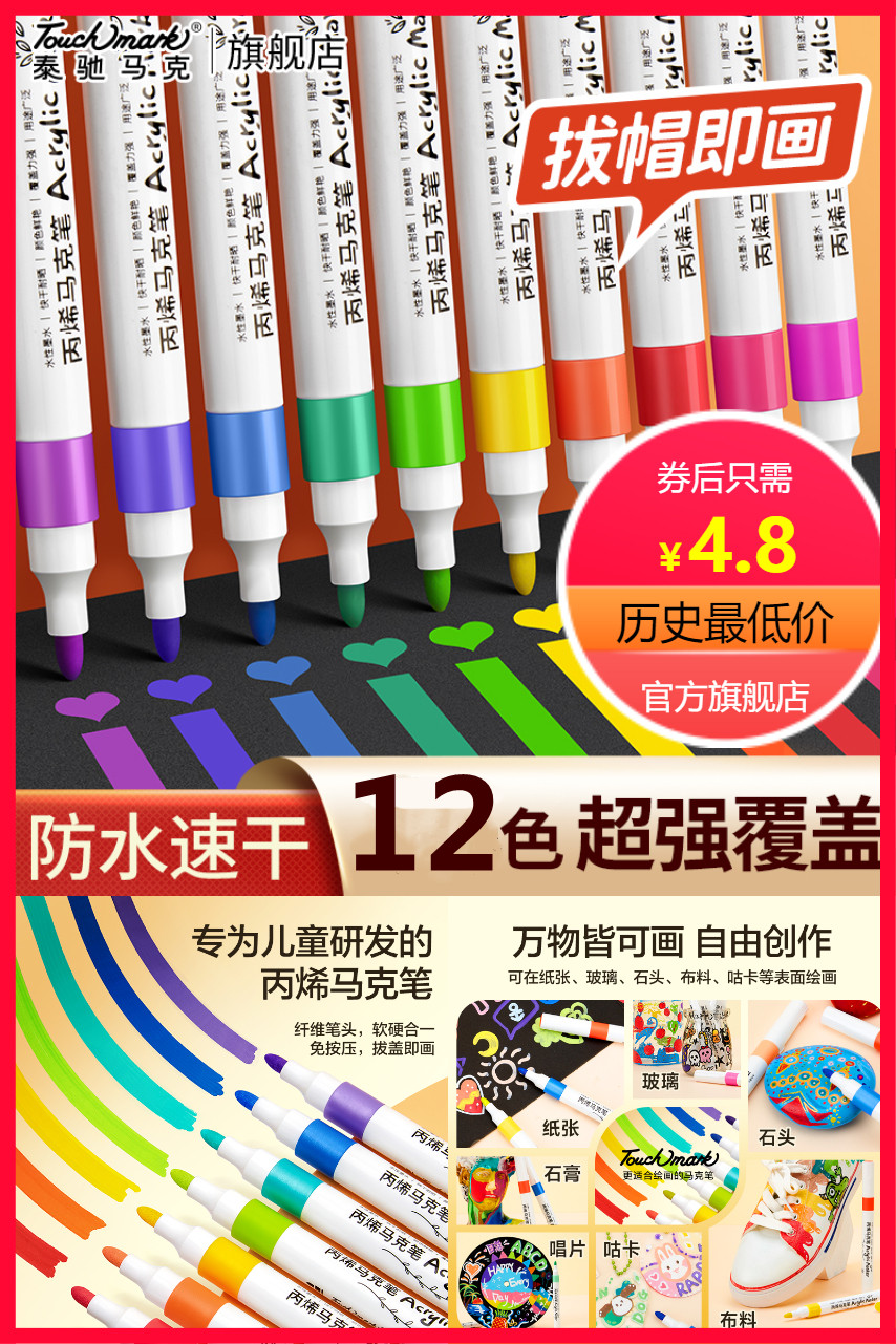 【大牌Touchmark!美术老师推荐】丙烯马克笔12支盒装仅需4.8元!还是免按压型马克笔!线下同品牌一盒都要29元!健康无异味!防水不褪色!国际标准色卡!可手绘,涂鸦DIY,画鞋画水杯!做手抄报!满足各种需求,适合各种场合!快囤起来!!!