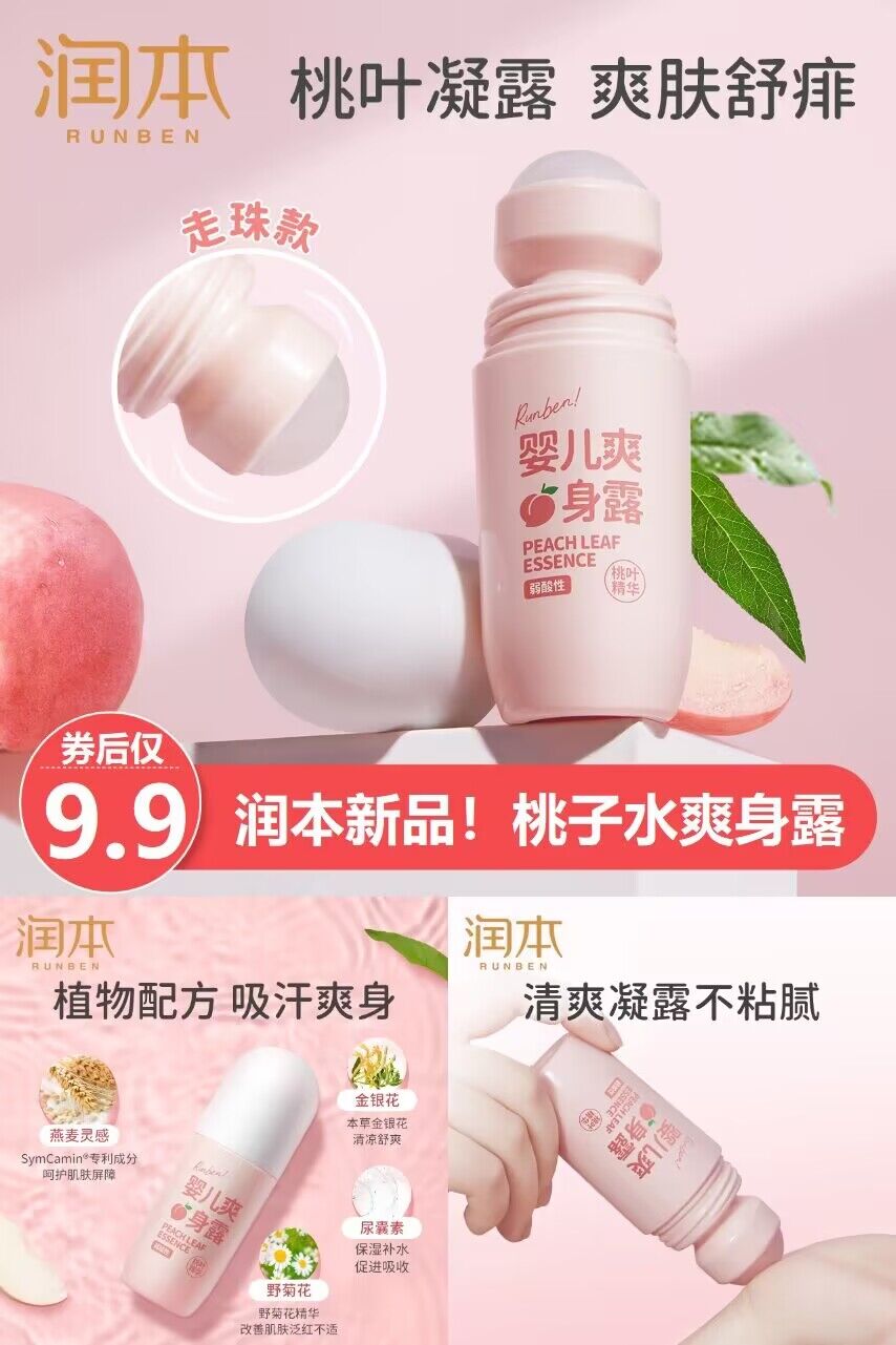 【润本新品!桃子水滚珠爽身露!9.9秒杀】太哇塞了!最.新的滚珠设计,告别痱子粉满天飞!添加桃叶精华+金银花+野菊花!宝宝皮肤干,起痱子,一涂马上好!全是植物精华,成分超安全!洗完澡当身体乳用也可以!