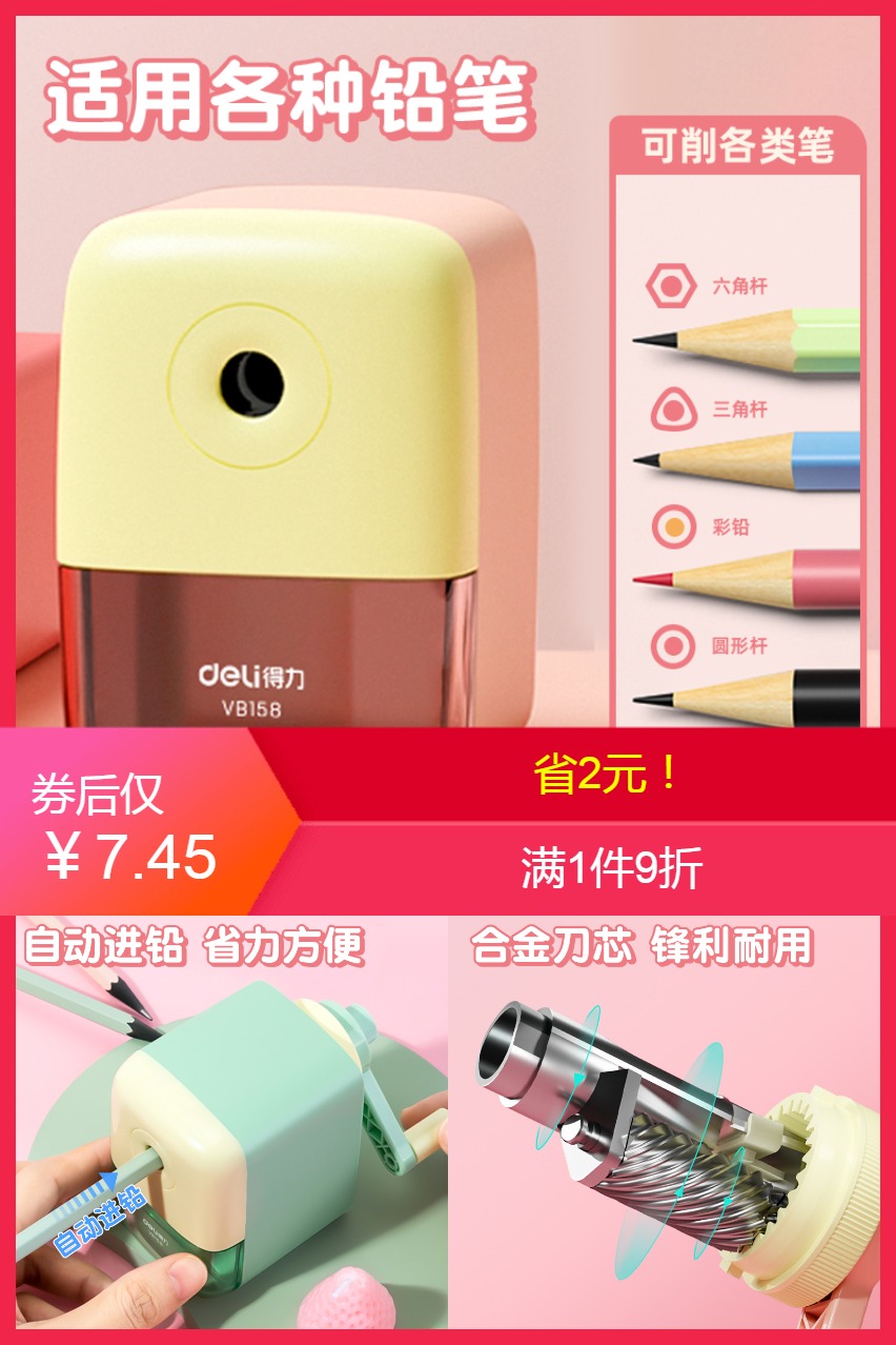 一件可享9折!多款可选,天猫榜单,卷笔刀好评榜第三名,得力大牌多功能自动进铅削笔器,匠心品质打造,自动进铅笔,防笔滑设计,方便快捷,不易断铅,安全结实耐用,省力不伤手,办公,学生必备~
