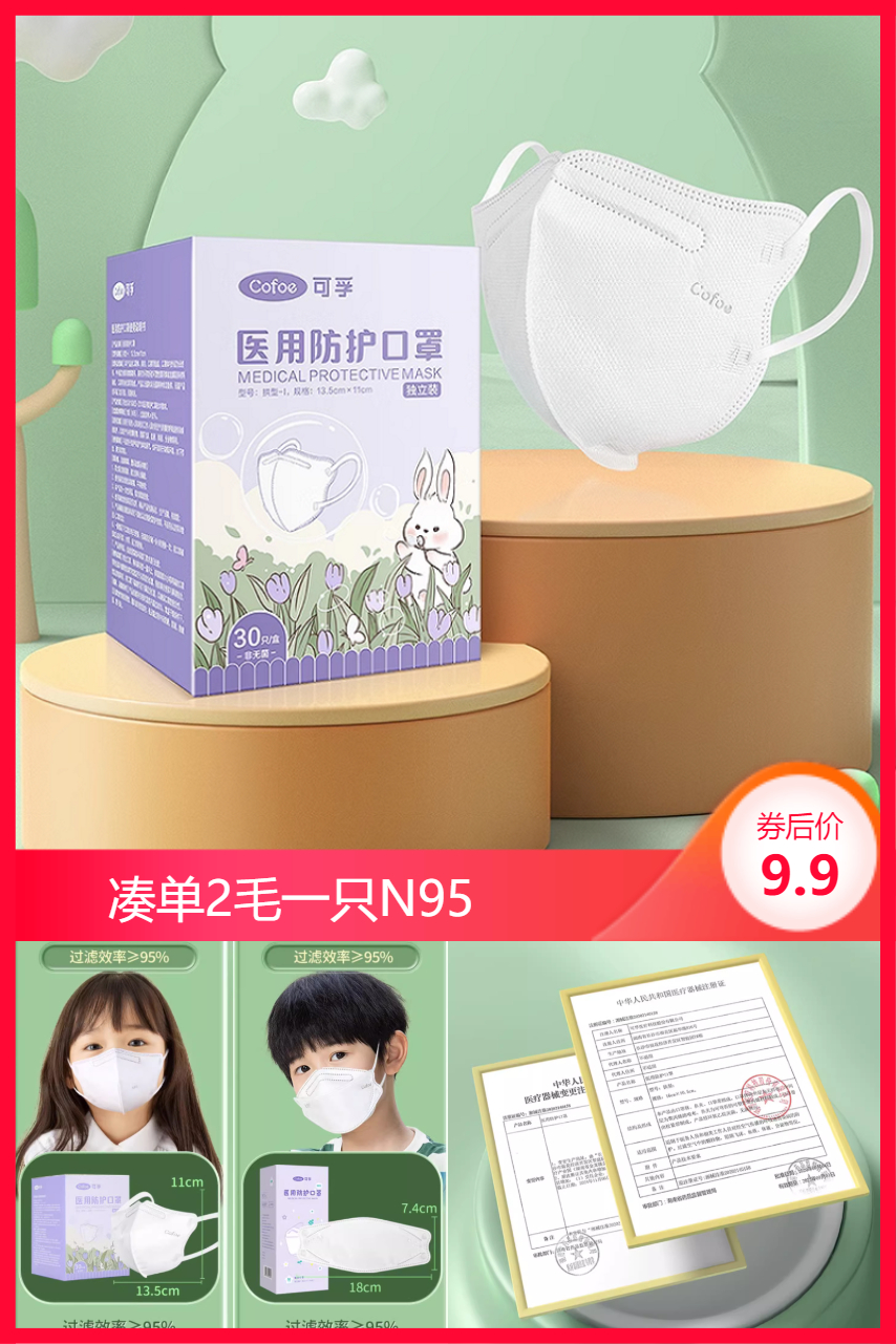 一片口罩只要2毛!!!可孚n95医用儿童防护口罩独立包装30只!看好了!这是真正医疗N95口罩!阻隔飞沫!4层独立包装!含双层医用99级熔喷布,错过是真错过了,超赞