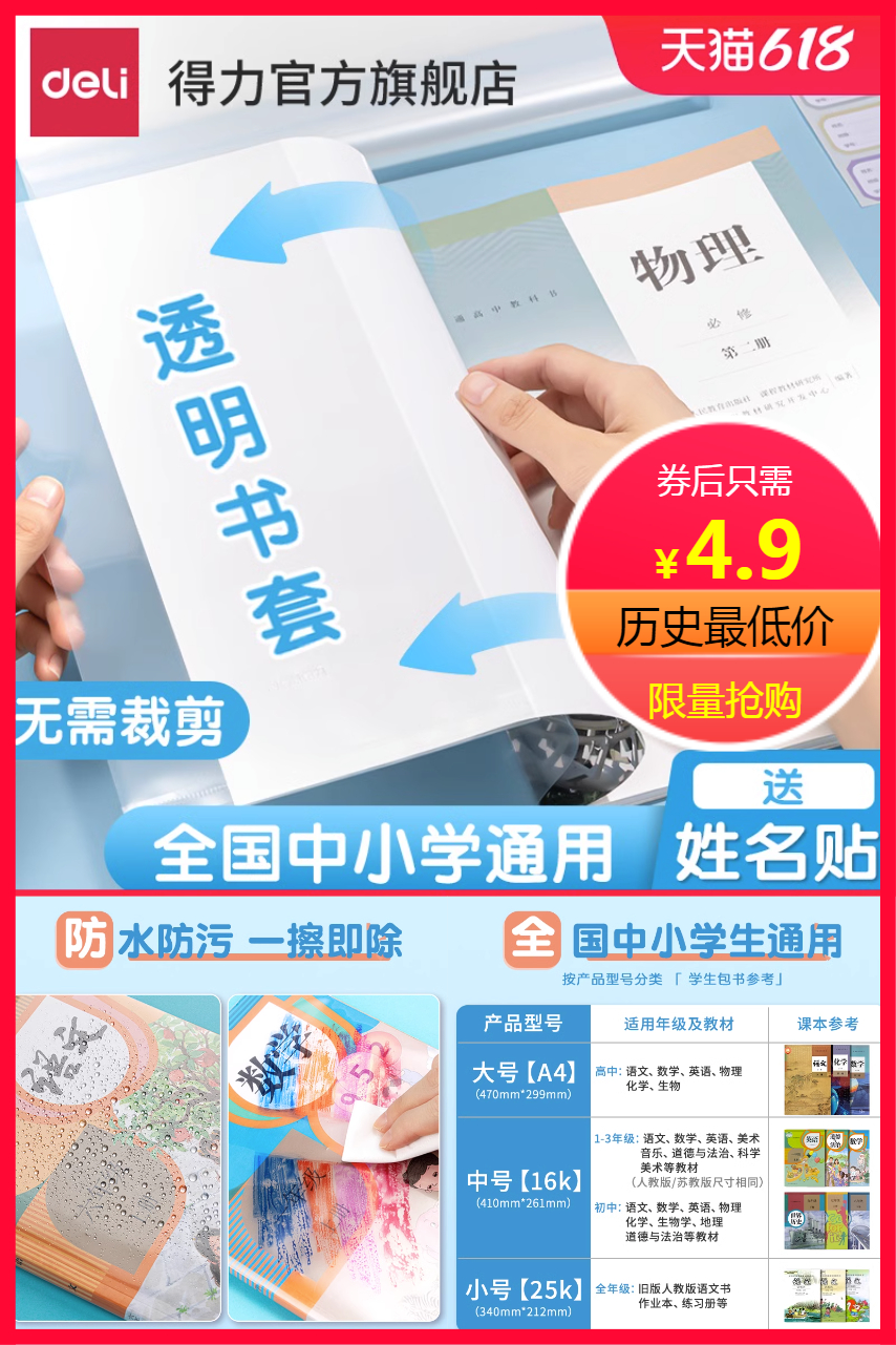 【得力官方旗舰店】10张中号书套+赠12枚姓名贴!大中小规格齐全,自带粘条粘固,不易脱落!CPP材质,透明防水防污耐用,一体防滑设计,无需裁剪,便携包装!数量有限,又快发新书了,快点提前做准备吧!