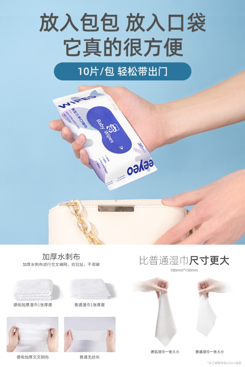 【补贴淘礼金2元。到手7.9元10包(11点开始)】婴幼儿新生宝宝手口专用便携湿纸巾,干净卫生,清洁护肤,面面俱到,选用天然优质棉,不掉毛,耐拉扯,无香味,无酒精,无添加,安全无刺激,入口也不担心