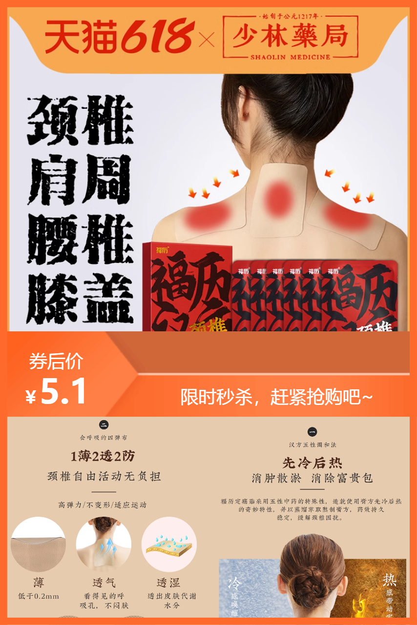 5.1到手6贴,单张颈椎贴有效是6个小时,保质期3个月,不影响使用,【福历】贴合呵护,舒适颈椎,草本原材,汉方好贴,先冷后热,快速渗透,易撕设计,不易黏连,传承经典古方,道地药材,科学配比,缓解多部位不舒适~