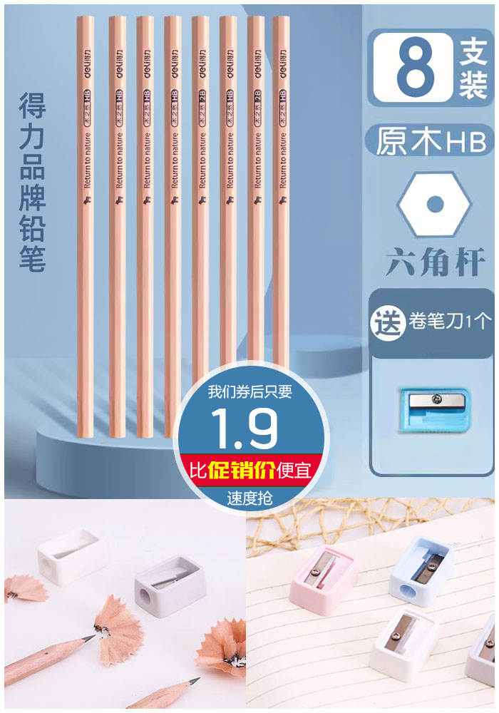 【券后价:1.9元】 【得力】原木六角杆铅笔8支+卷笔刀