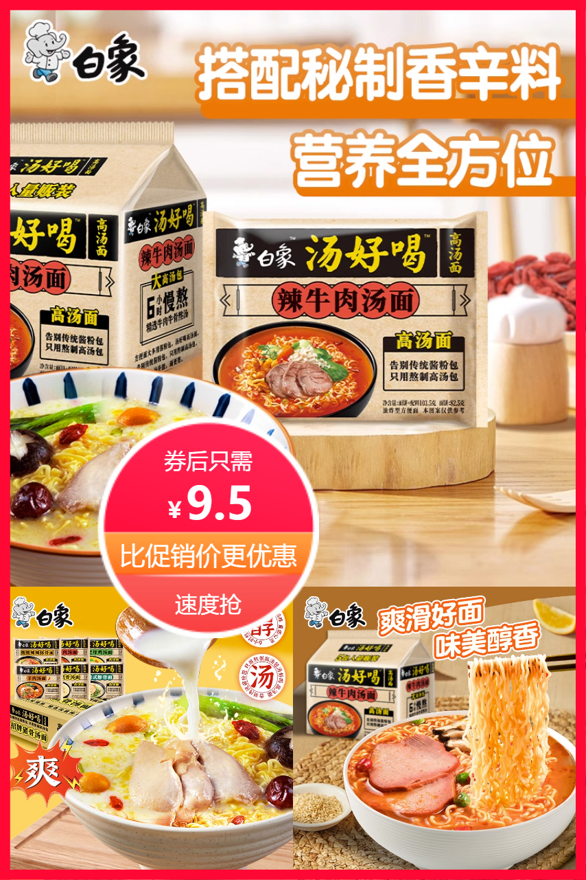 家人们,一起支持国货!白象老母鸡汤面*3袋+白象方便面2袋汤鲜面滑,加点配料,健康美味还方便