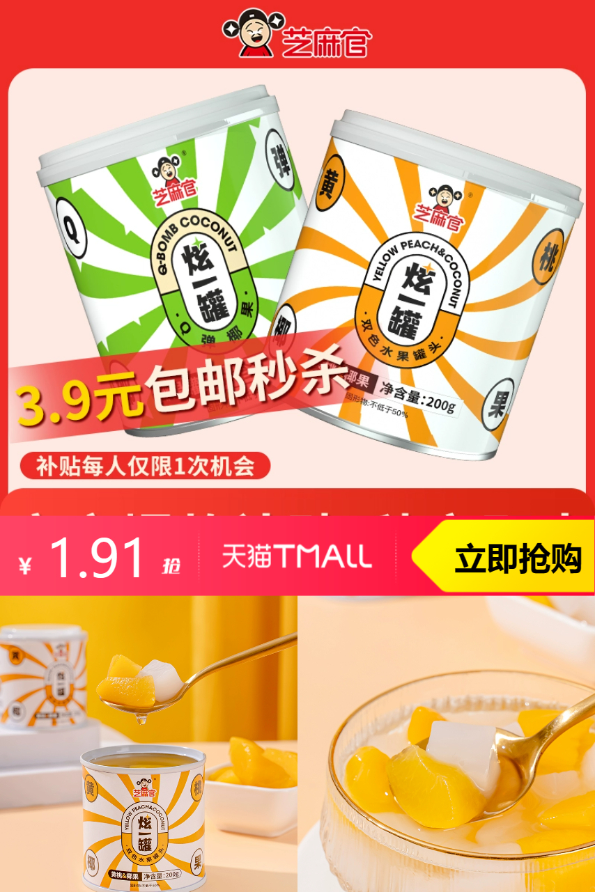 【券后价:1.91元】 补贴到手1.91!芝麻官黄桃椰果罐头200g
