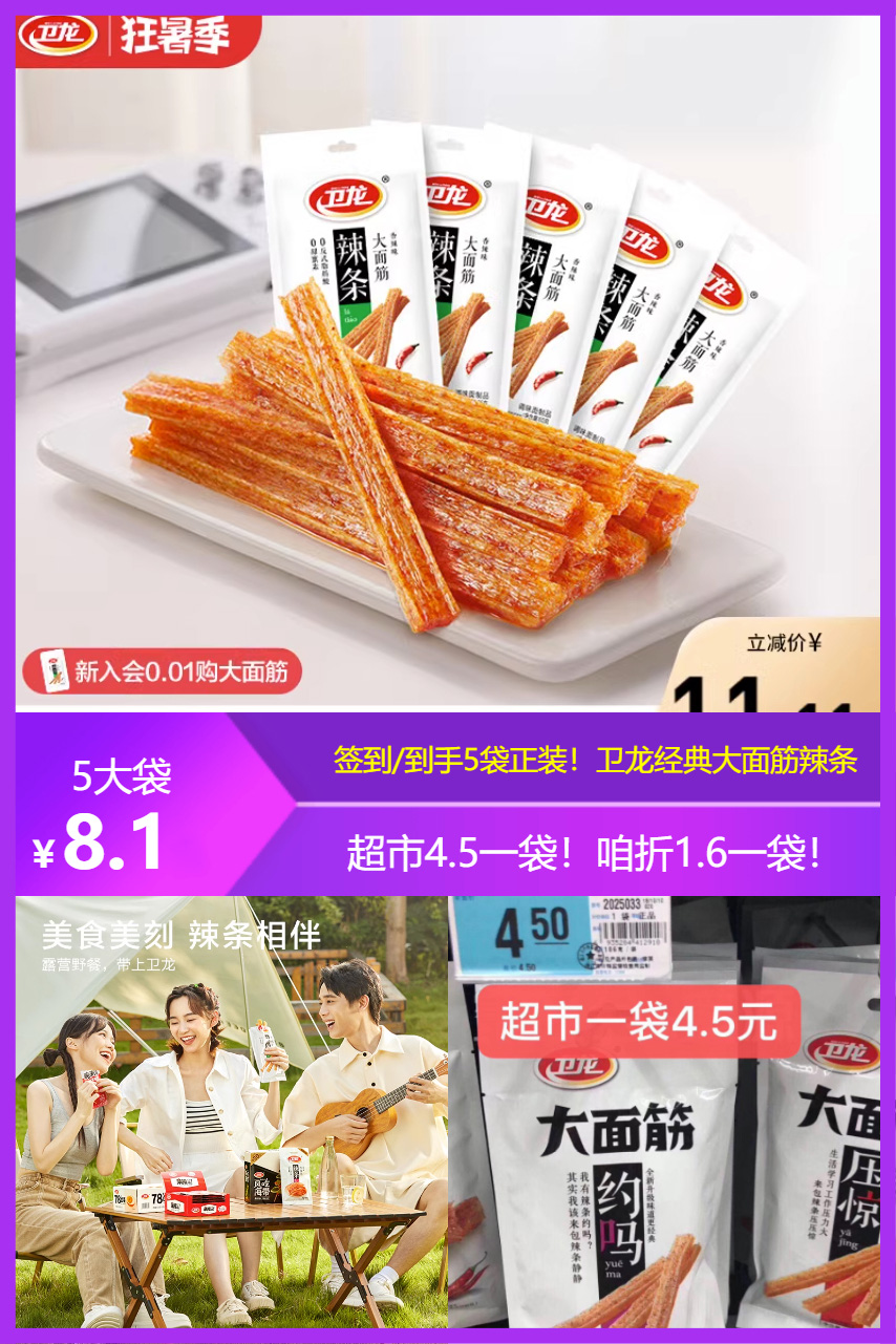 【券后价:8.1元】 签到!到手5袋!新日期!卫龙大面筋辣条