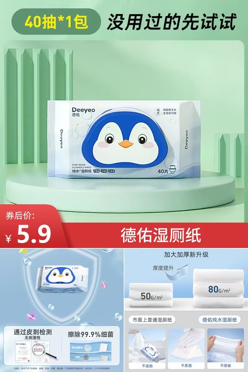 买湿厕纸,就选德佑!!弱酸纯水配方,更温和安全!一擦即净,清爽如水洗!早买早享受!!湿厕纸用过就戒不掉!!