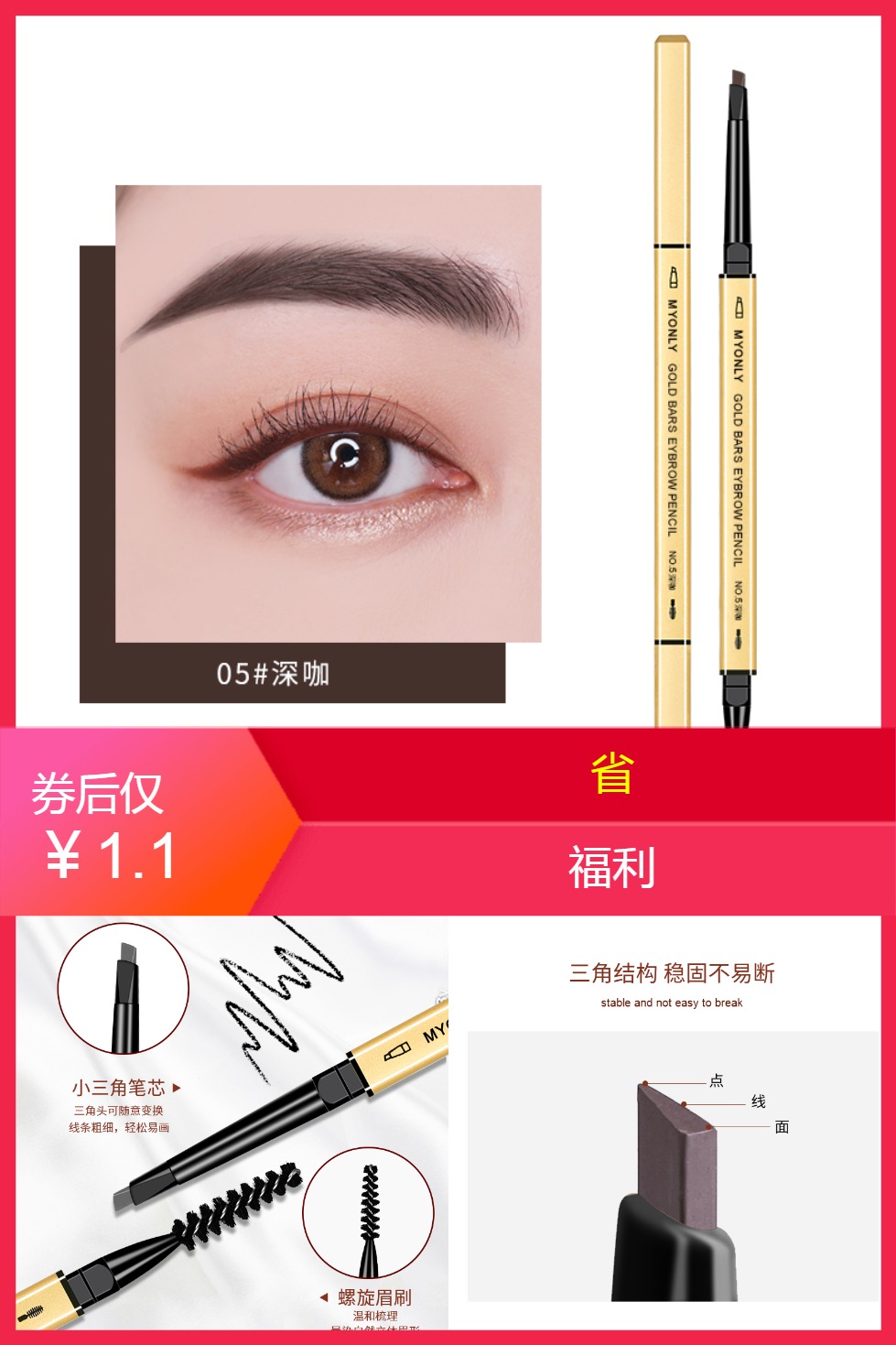 只要1.1元+签到!这泼天的富贵终于轮到我的家人们了,双头纤细小金筷眉笔,麦欧丽双头纤细小金筷眉笔大促销!双头设计,轻松描绘眉峰、眉尾和眉间,适合各种眉形。富含维生素E,滋润肌肤,修复干燥。限时优惠,错过再等一年!家人们冲啊!!!