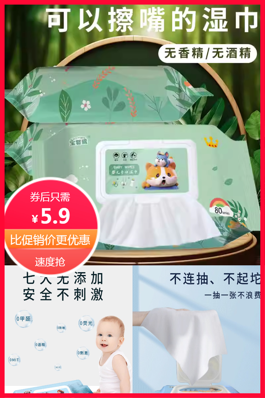 【黑盒+签到】2包共120抽直接2~3元撸!!!抓紧冲啊,无酒精、香精添加,温和不刺激!专为婴儿设计的手口湿巾!包装是带盖子的那种!双层锁水,嘎嘎好用~