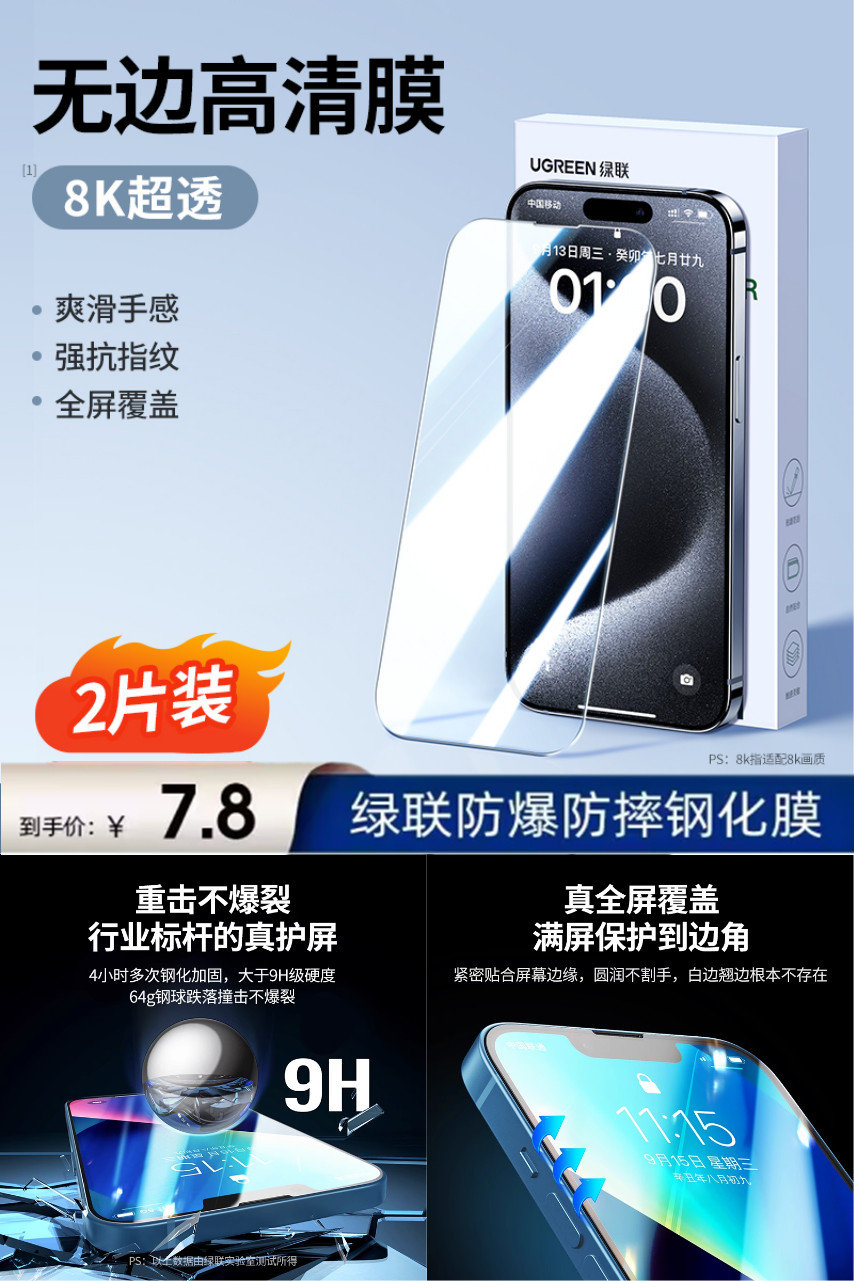 【券后价:7.8元】 首单签到!2片绿联苹果8K超透晶钻钢化膜