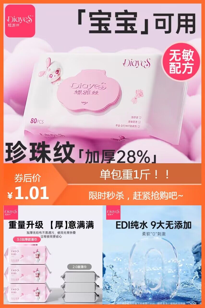天降到手1.01元!!超大一包80抽,加厚湿纸巾,足足一斤重,温和洁净,孕妈婴幼儿都可用!安全0添加,软到没朋友,给肌肤亲柔呵护!!!