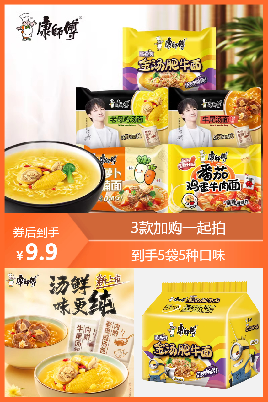 【3款加购一起拍!】官补3元!5袋到手9.9元!线下3元一包!今天折1块多!康师傅多口味方便面!国民老品牌,畅销30年,线下商超有售!老母鸡汤、牛尾汤、番茄鸡蛋等,都是热卖口味!日期新鲜,爽口弹滑,汤汁浓郁,让你一次吃到爽!