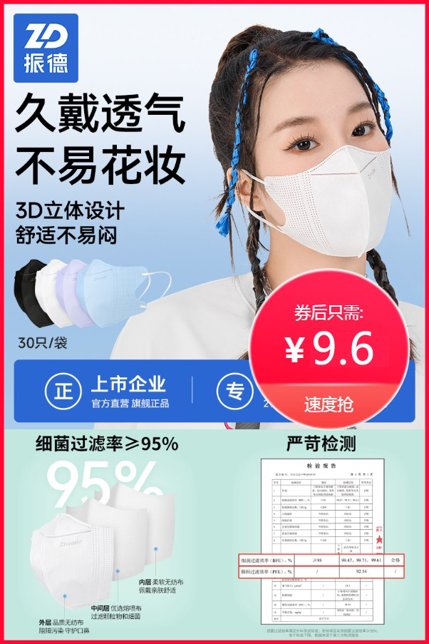 2代升级【振德】3D立体透气口罩30只,双色可选,优选面罩和耳带材质,亲肤透气,舒适佩戴,三层防护细菌过滤,戴上修饰脸型,摘下保护口红和妆容!上市企业更安心!【赠运费险】