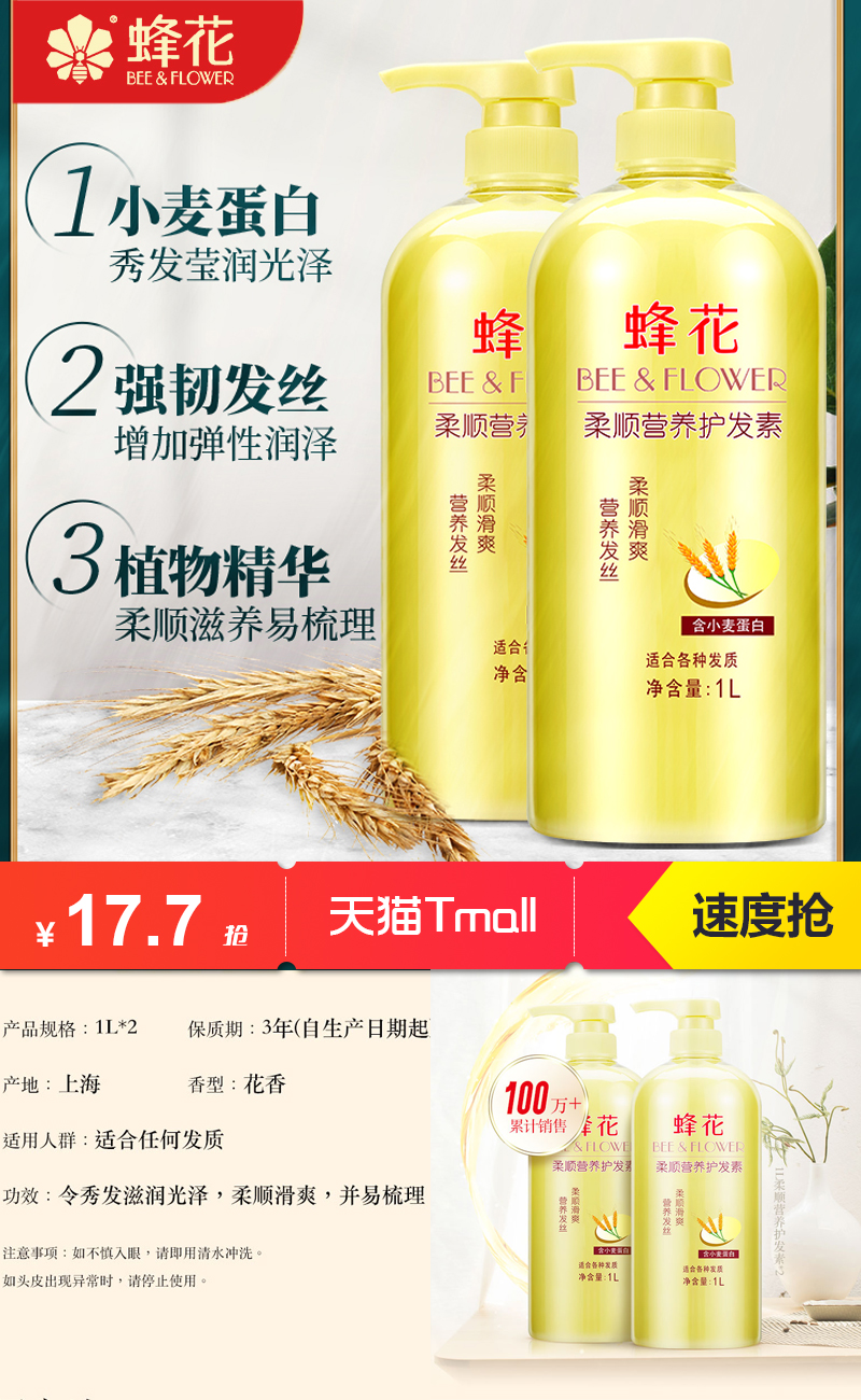 【券后价:17.7元】 蜂花小麦蛋白护发素1L顺滑补水修护