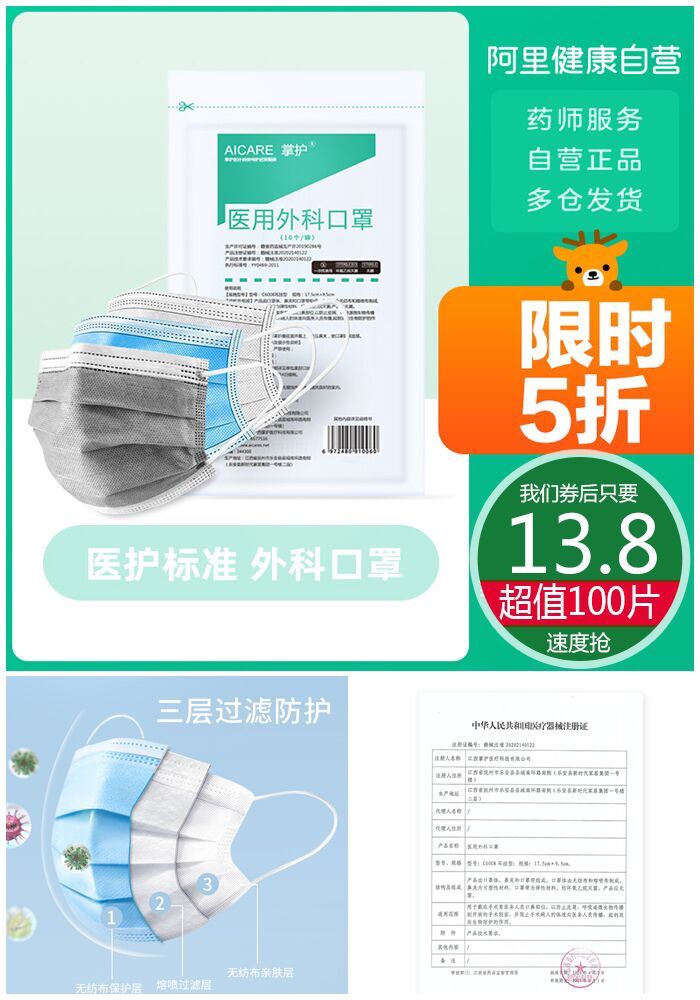 【券后价:13.8元】 【阿里健康】掌护医用外科口罩100只