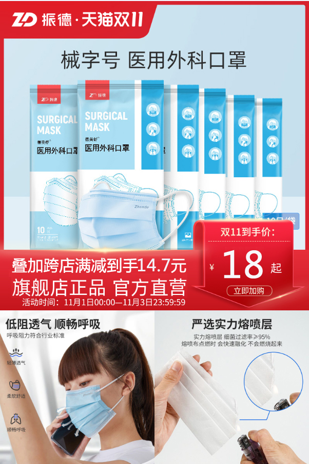 【叠加跨店满减到手14.7】【68万+高分好评】振德外科口罩120只,符合YY0469-2011国家行业标准,三层过滤,细菌过滤高达95%,柔软透气,高弹耳带空间大,上市振德!【赠运费险】