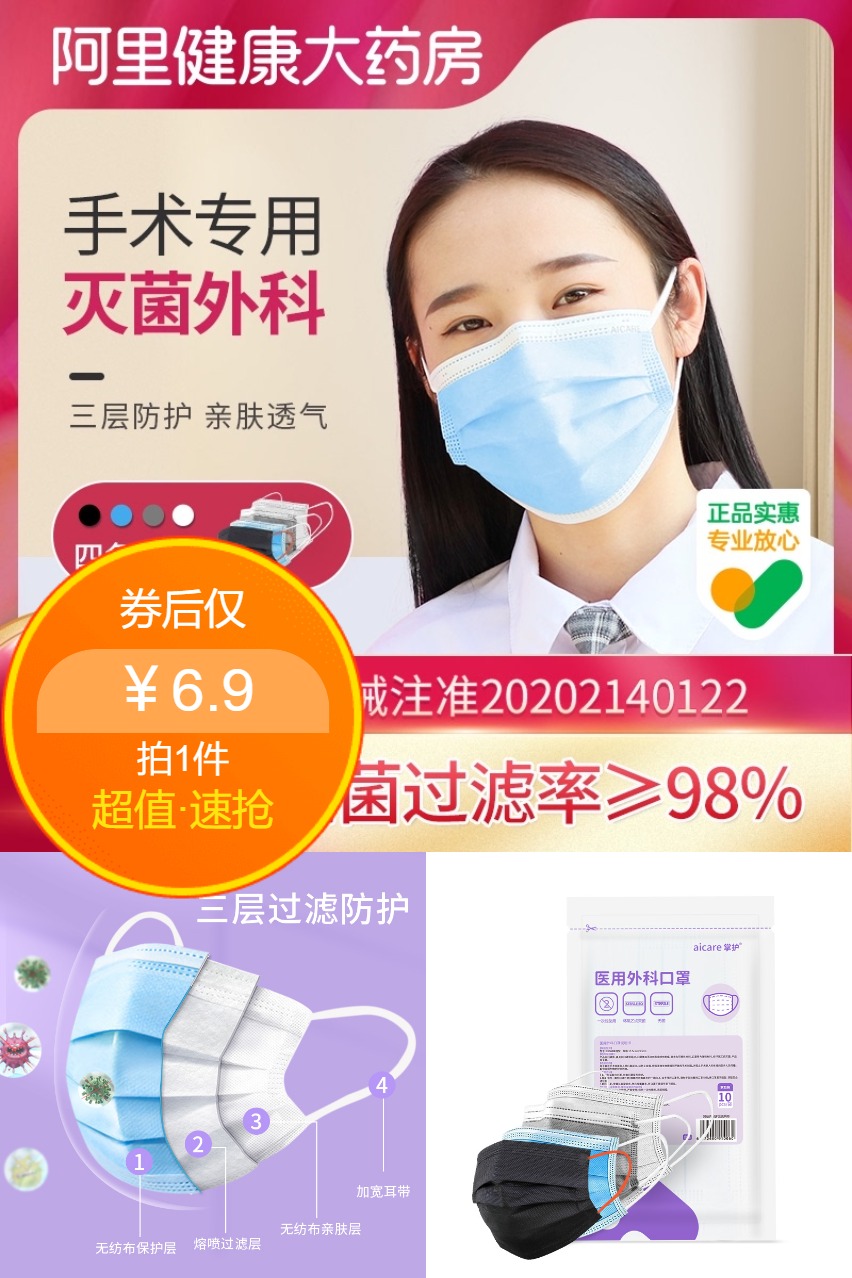 【50个到手仅6.9】【阿里大药房官方直营】,院线同款,这是械字号医用外科口罩,灭菌级的!防护加强够安心,轻柔透气,三层防护更安全~