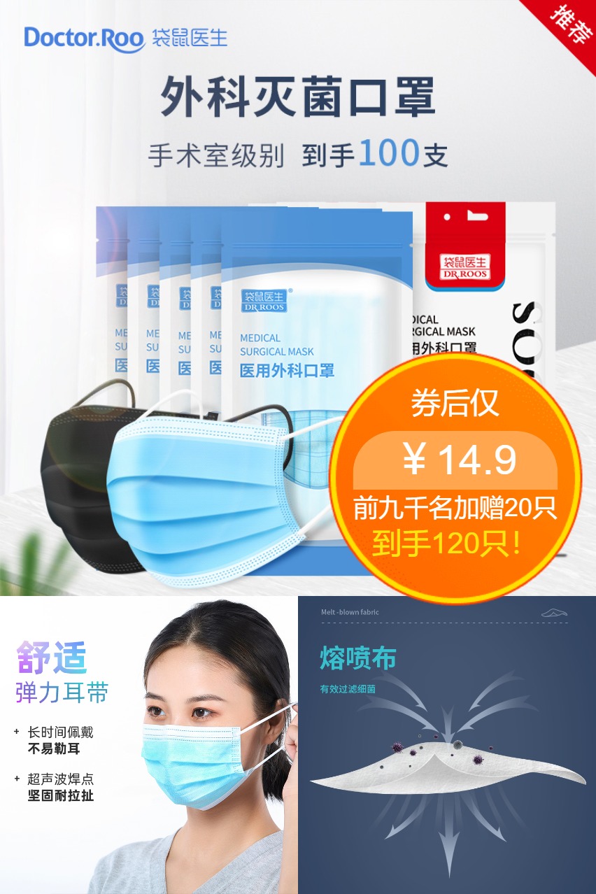 【券后价:14.9元】 【前9000加送20只】袋鼠医生外科口罩120只