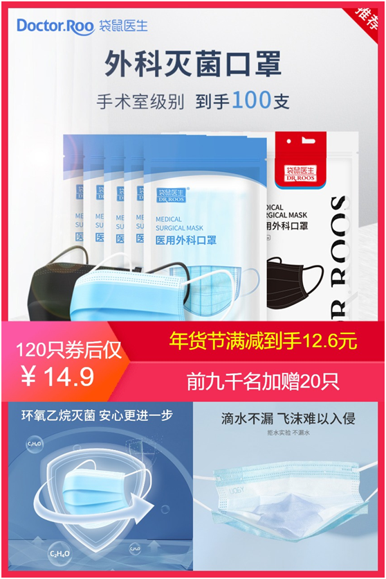 【年货节满减到手12.6元】【前9000名加送20只,到手120只】袋鼠医生外科口罩,环氧乙烷灭菌,外科口罩更柔更透气,三层防护更安全,阻隔外界飞尘,飞沫~空间大,防疫必备!【赠运费险】